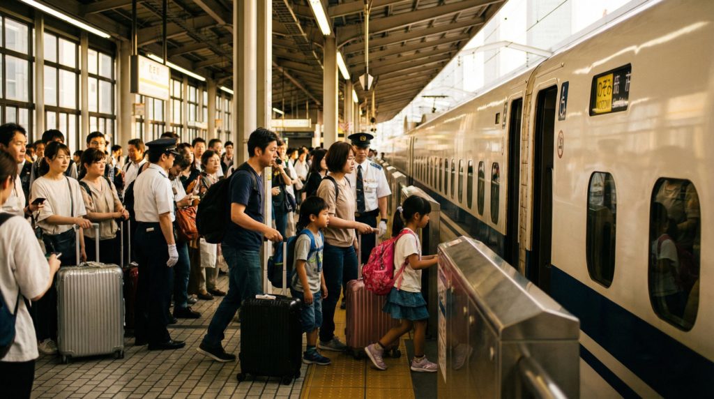 大型連休ならではの旅行や帰省シーンを表現したイメージ写真です。スーツケースやリュックを持って駅や空港へ向かう家族の姿は、ゴールデンウイーク、GW、家族旅行、帰省、観光、移動といったキーワードを自然に想起させます。笑顔や期待感のある表情は、休日、レジャー、思い出作りといったポジティブな印象を伝えます。交通機関、観光業、宿泊施設、レジャー施設、Webサイト、広告、SNS投稿、特集記事など幅広い用途で活用でき、季節感とワクワク感を演出できる高品質な写真素材です。